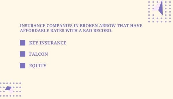 If you have a bad driving record and no insurance history here are a few insurance companies in Broken Arrow that have affordable insurance coverage: