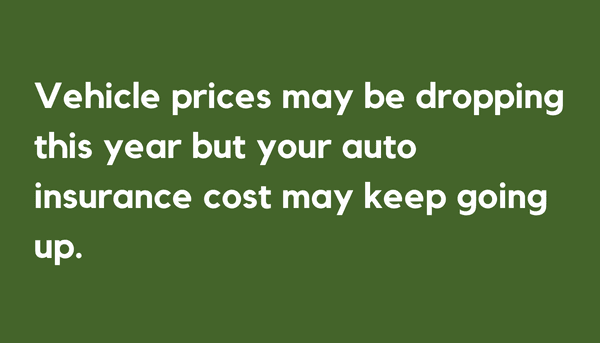 Vehicle prices may be dropping this year but your auto insurance cost may keep going up.